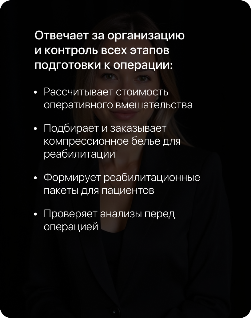 Записывает на консультацию, отвечает на вопросы и помогает в организации операции.